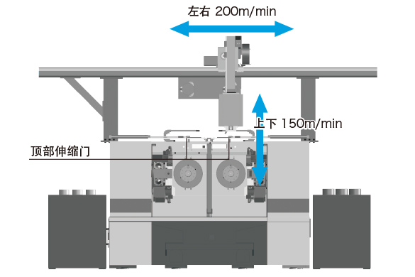 提高生產(chǎn)效率(縮短生產(chǎn)間隔時(shí)間) 工件裝卸時(shí)間 裝卸時(shí)間4.1秒 裝載時(shí)間19.8秒(包括主軸定位停止、就位檢測時(shí)間) 高速行架 左右 200m/min 上下 150m/min 左右開閉式頂部伸縮門 ![]() |